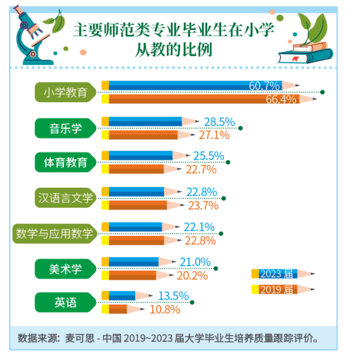 另外,师范类院校2023届体育教育、英语、音乐学等专业毕业生在小学从教的比例较2019届提升较为明显。音体美等学科师资投入力量加强,符合促进小学生全面发展的要求。为确保这些学科教育的深入发展,需关注相关师范类专业的人才培养结构及培养体系调整。